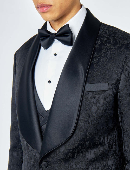 HENRY – BLACK DAMASK FLOCKED JACQUARD PRINT 3 PIECE TUXEDO SUIT