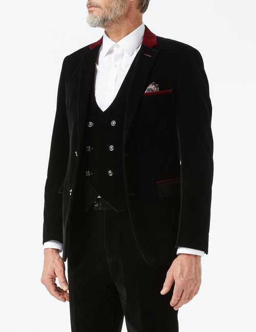 - Dies ist ein schicker Samtanzug, auf den man sich immer wieder verlassen kann. Wir können ihn als kompletten dreiteiligen Anzug für ein traditionelles Gefühl oder als maßgeschneiderte Einzelteile für einen modernen, zeitgenössischen Look tragen