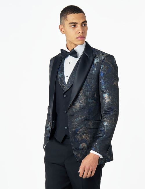 HENRY – BLACK DAMASK FLOCKED JACQUARD PRINT 3 PIECE TUXEDO SUIT