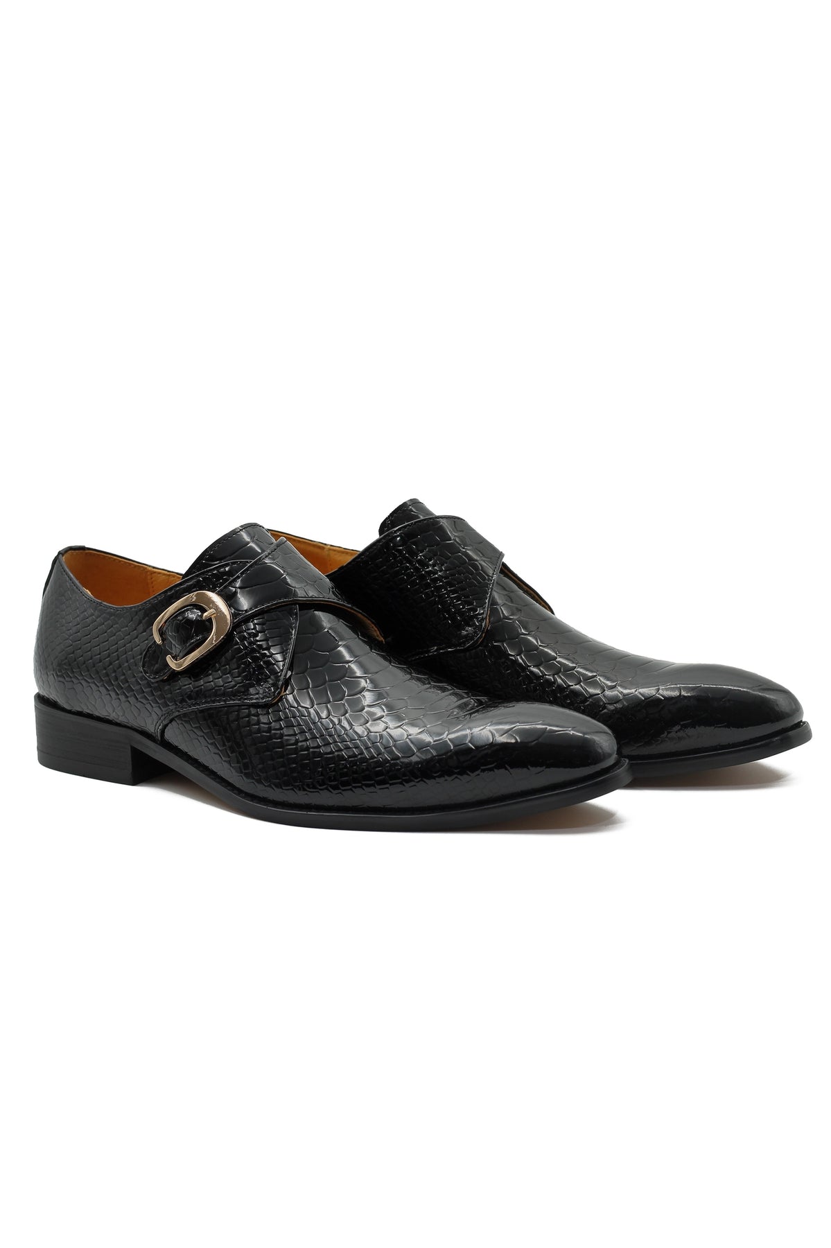 BLACK CROC PRINT PATENT LEATHER MONK SHOES