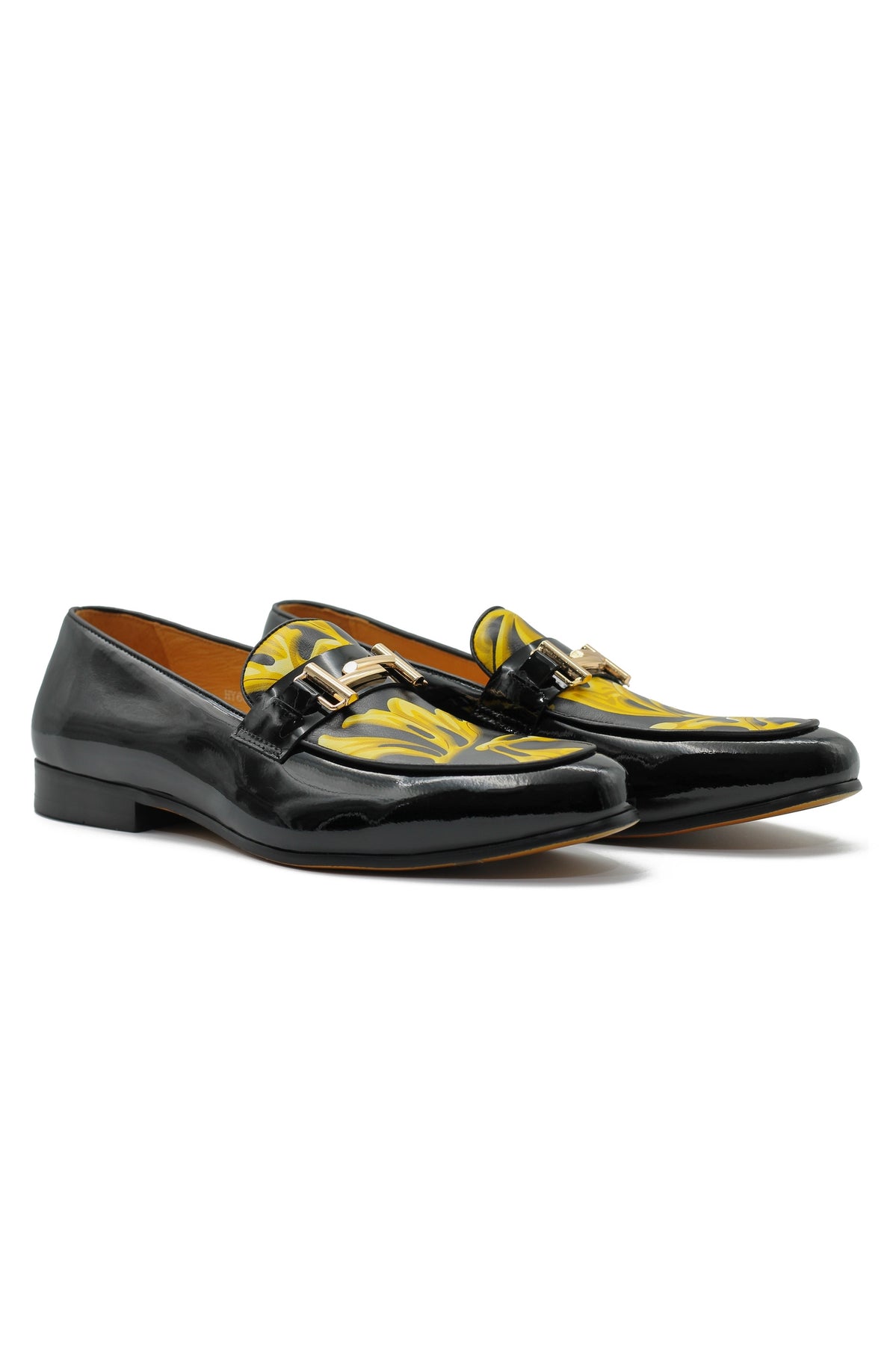 Hand crafted from black shiny glossy genuine leather sides and finished with black yellow floral print on upper
