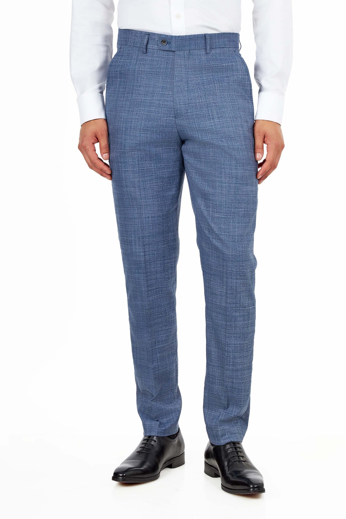 Make a confident impression with the XPOSED London Steel Blue Tailored Fit Suit, a refined two-piece designed for modern workwear, travel, and smart-casual occasions. Crafted from a premium textured weave fabric, this suit features a sophisticated steel blue tone that offers a fresh alternative to navy while remaining timeless and versatile. The polyester–viscose blend provides comfort, structure, and durability, while the tailored-fit jacket with sharp peak lapels and clean-cut trousers deliver a polished, contemporary silhouette that can be worn together or styled separately.
