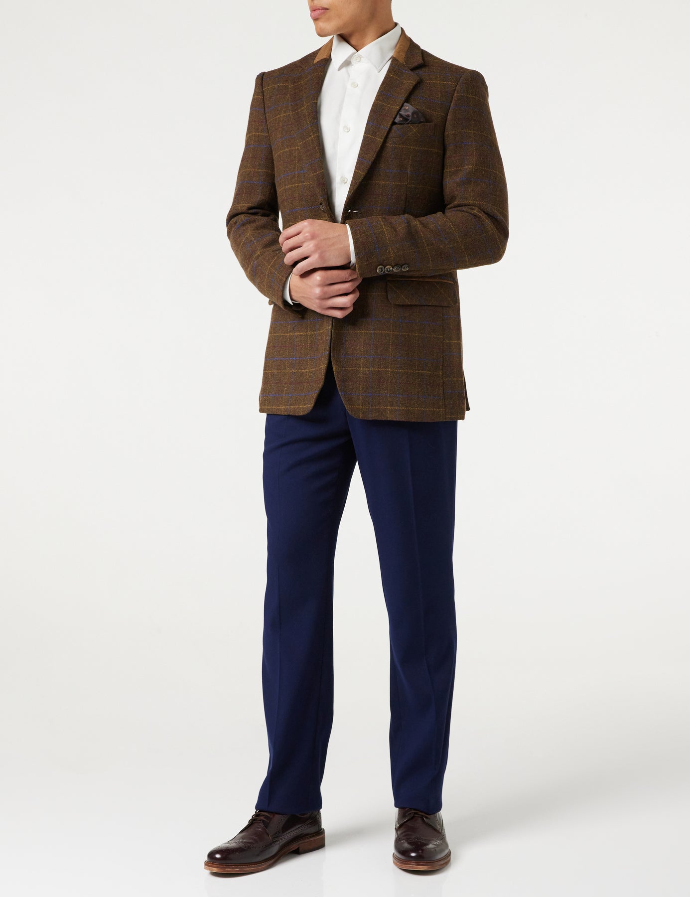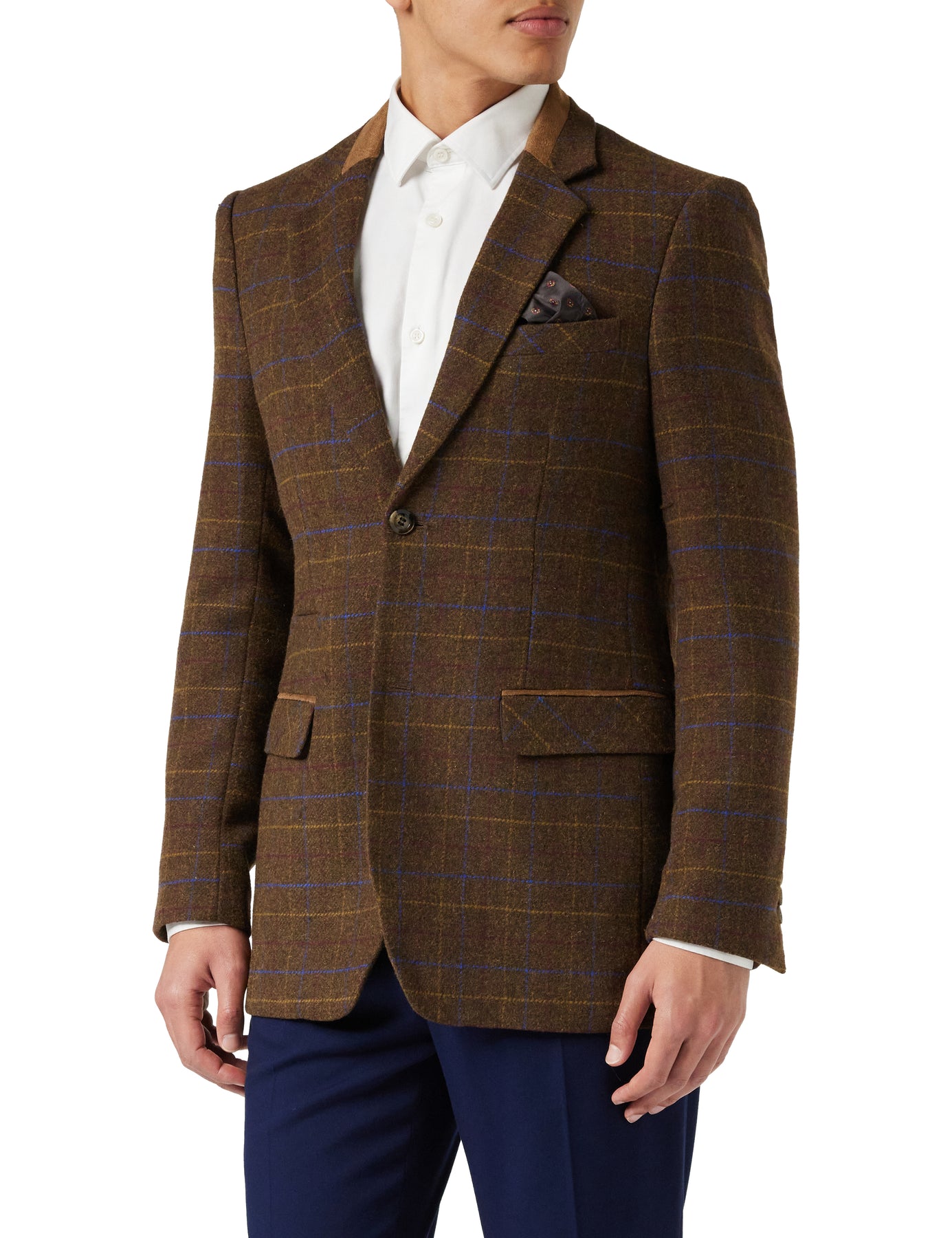 Veste de costume traditionnelle à deux boutons à chevrons avec carreaux bleus ton sur ton sur détails brun clair