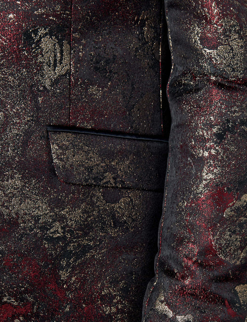 Complete the look with the matching black waistcoat featuring printed lapels and plain black trousers, making it a perfect choice for any party or special occasion.