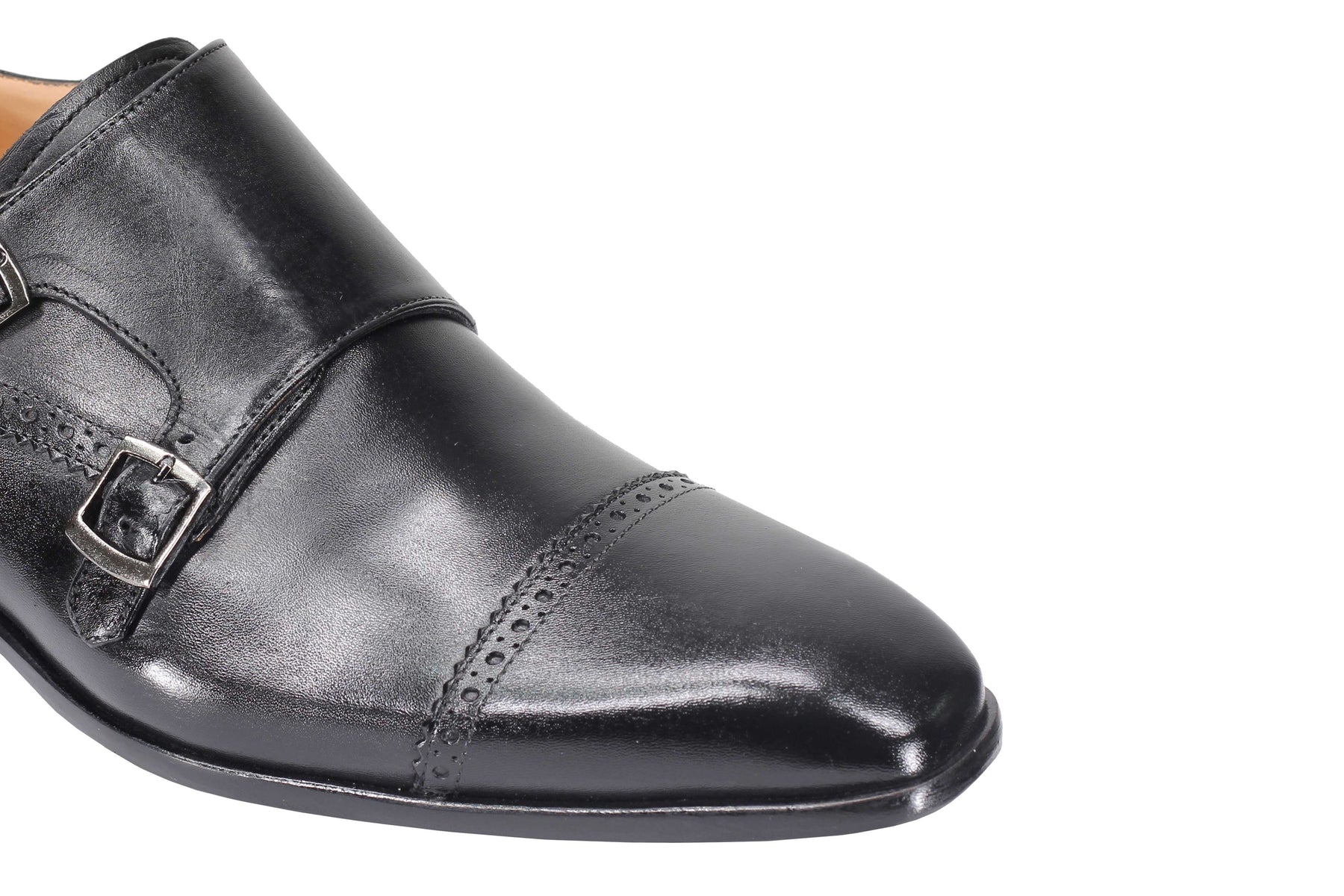 BLACK CALF LEATHER SEMI BROGUE MONK SHOES