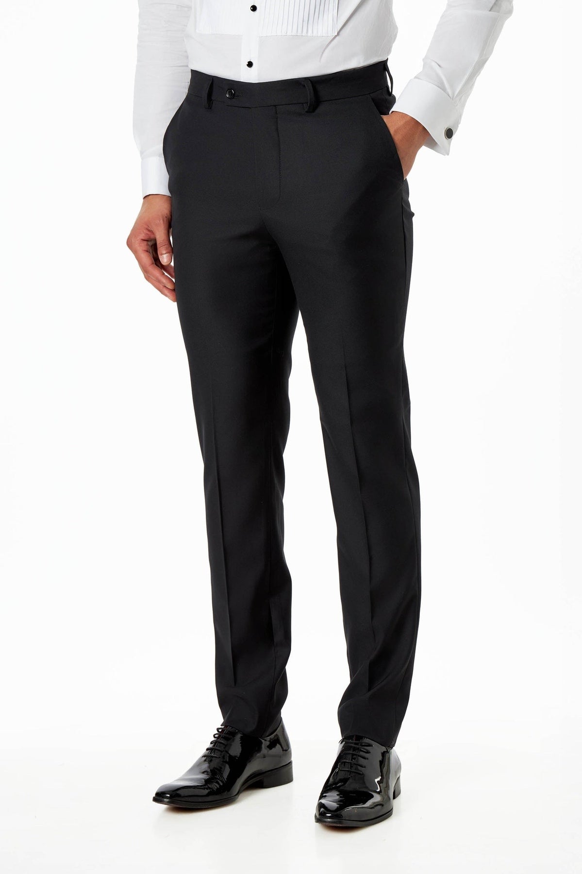 Classic Tuxedo Styling - Flat-front design with sleek detailing for timeless formal appeal.