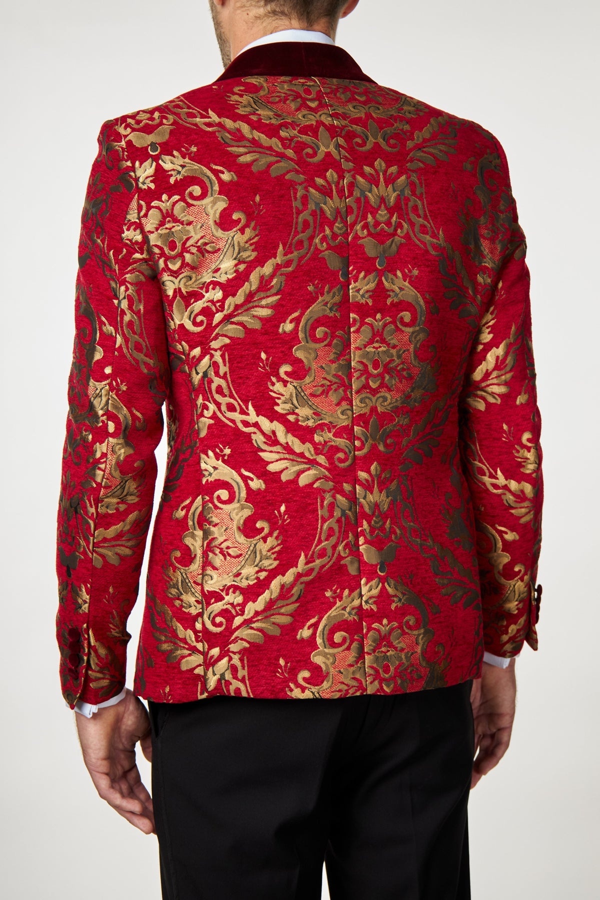 Our GLEN dinner jacket boasts the rich intricate gold floral paisley pattern on crimson red Jacquard which adds depth and character, ensuring you stand out from the crowd.