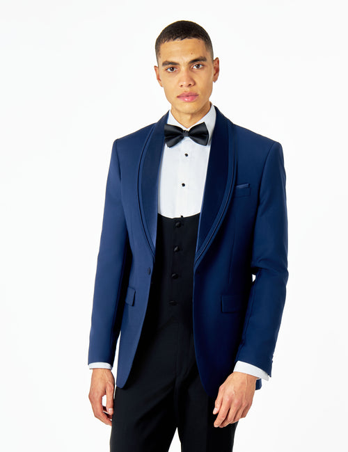 The jacket features a refined shawl lapels with black sateen trim, Matching black pocket square in breast pocket, Single breasted front fastens with one sateen button, Double vents in back.