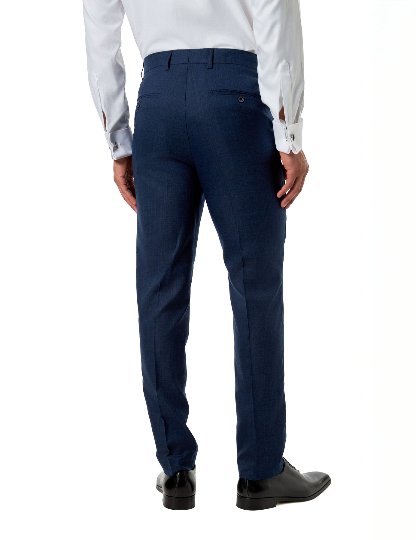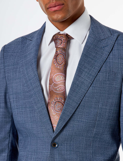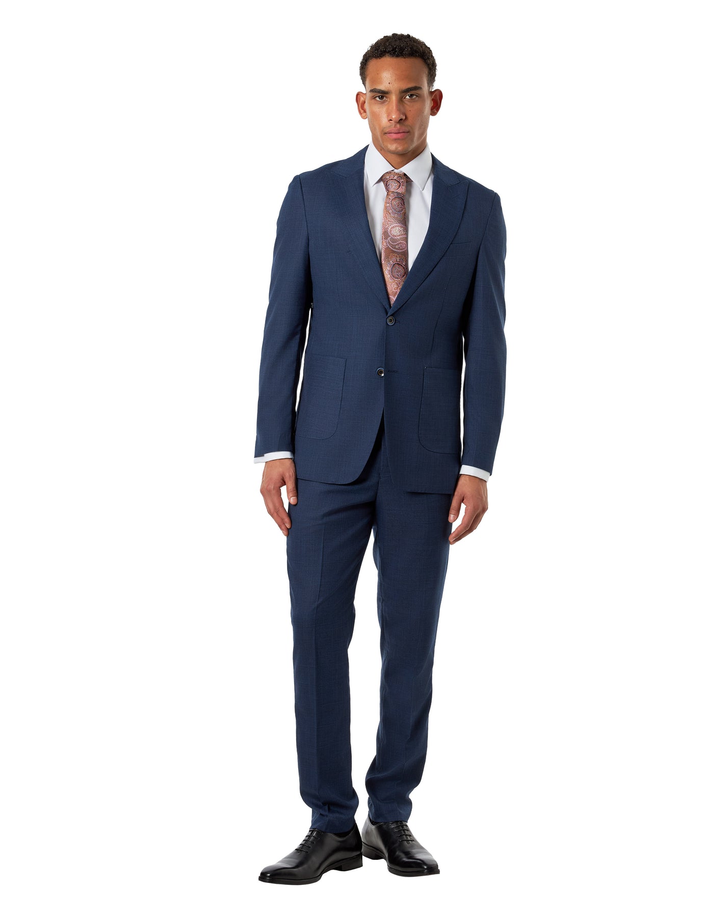 Size Tip: The tailored fit jacket features peak lapels, patch pockets, and double rear vents, creating a sharp silhouette with ease of movement. The matching trousers are cut in a complementary tailored fit, sitting neatly at the waist with a clean, modern leg line.