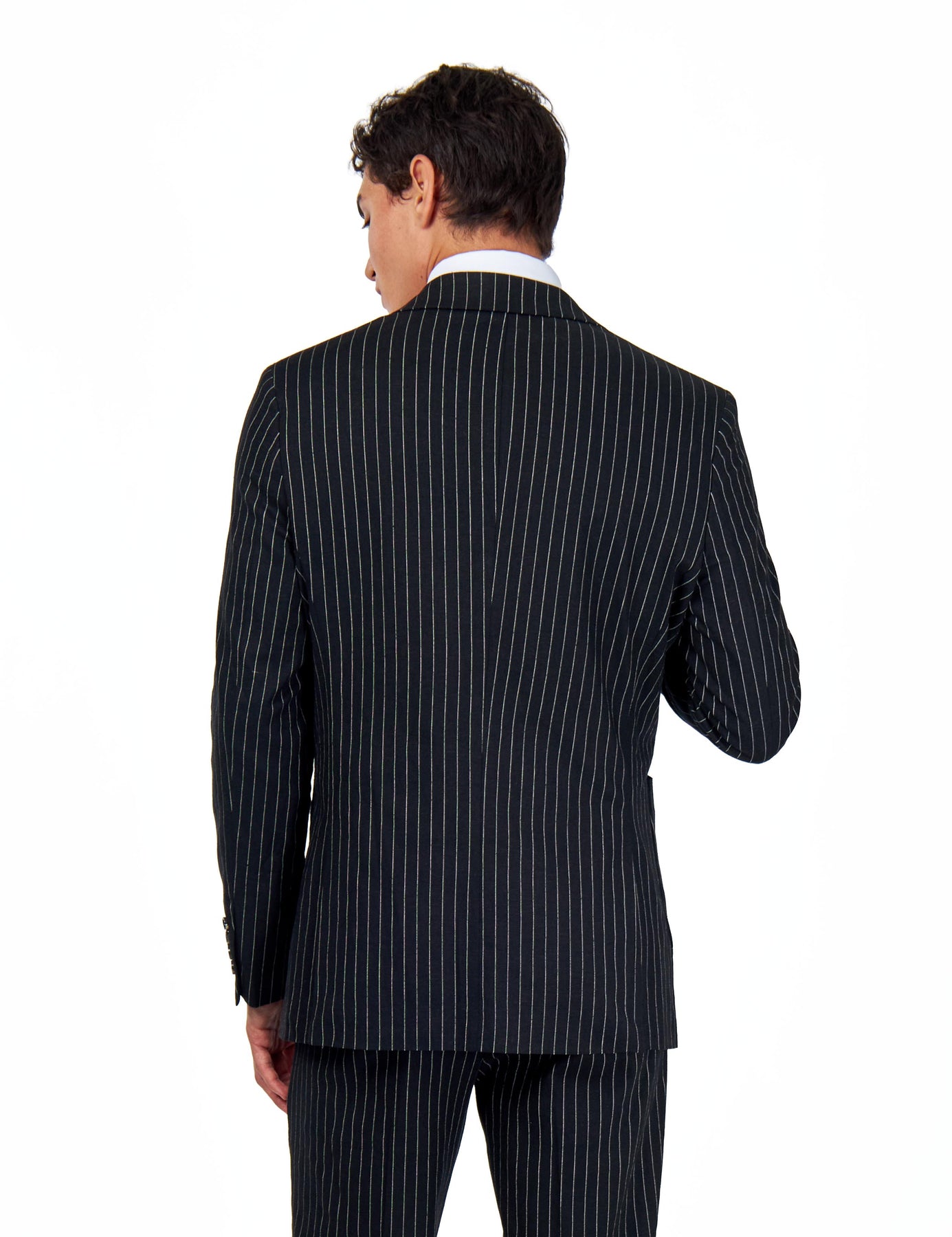 The jacket features a classic double-breasted six-button front, structured peak lapels, and functional patch pockets, all detailed with refined AMF stitching. The pinstripe pattern adds a timeless touch, making this a versatile option for both traditional and modern style enthusiasts.