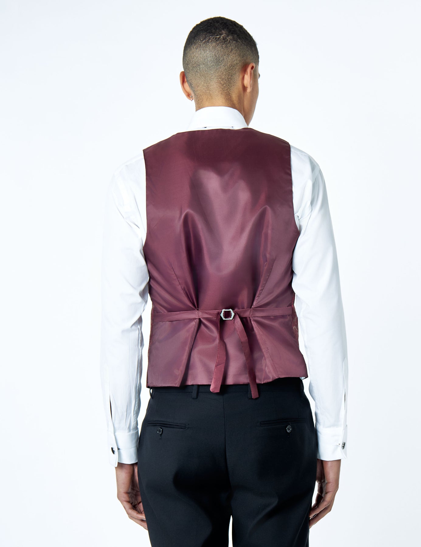 Louis Wine Burgundy jacquard paisley print dinner suit waistcoat is the ultimate expression of formal men’s groom’s wear. Add a modern twist while maintaining timeless elegance, this design will strike the perfect balance between blending in and standing out. The waistcoat features a refined floral-patterned fabric with sateen lapels