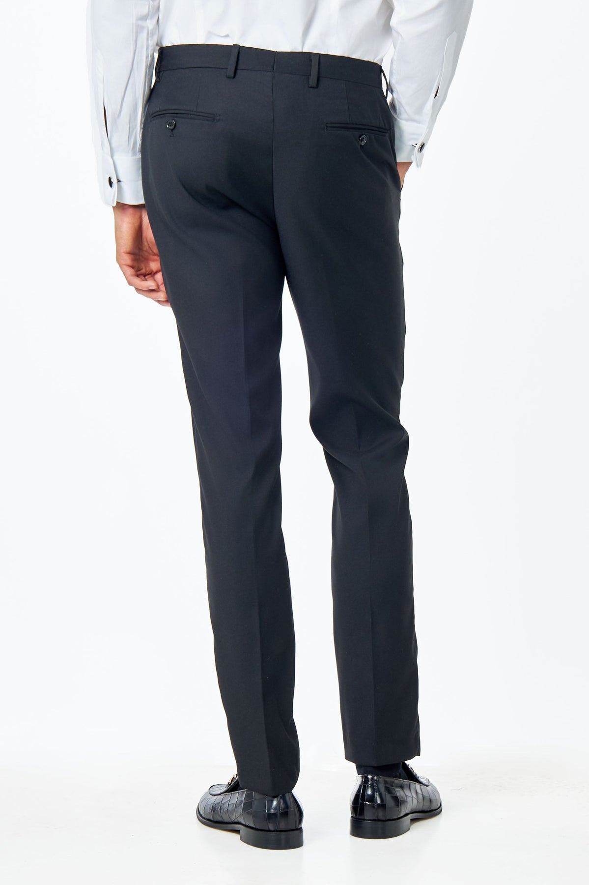 Introducing our tailored-fit suit trousers in plain black. This pair of trousers features tapered legs, Flat front, Half lining, Cross pockets, Buttoned welt pockets back, Zip Hook & eye closure