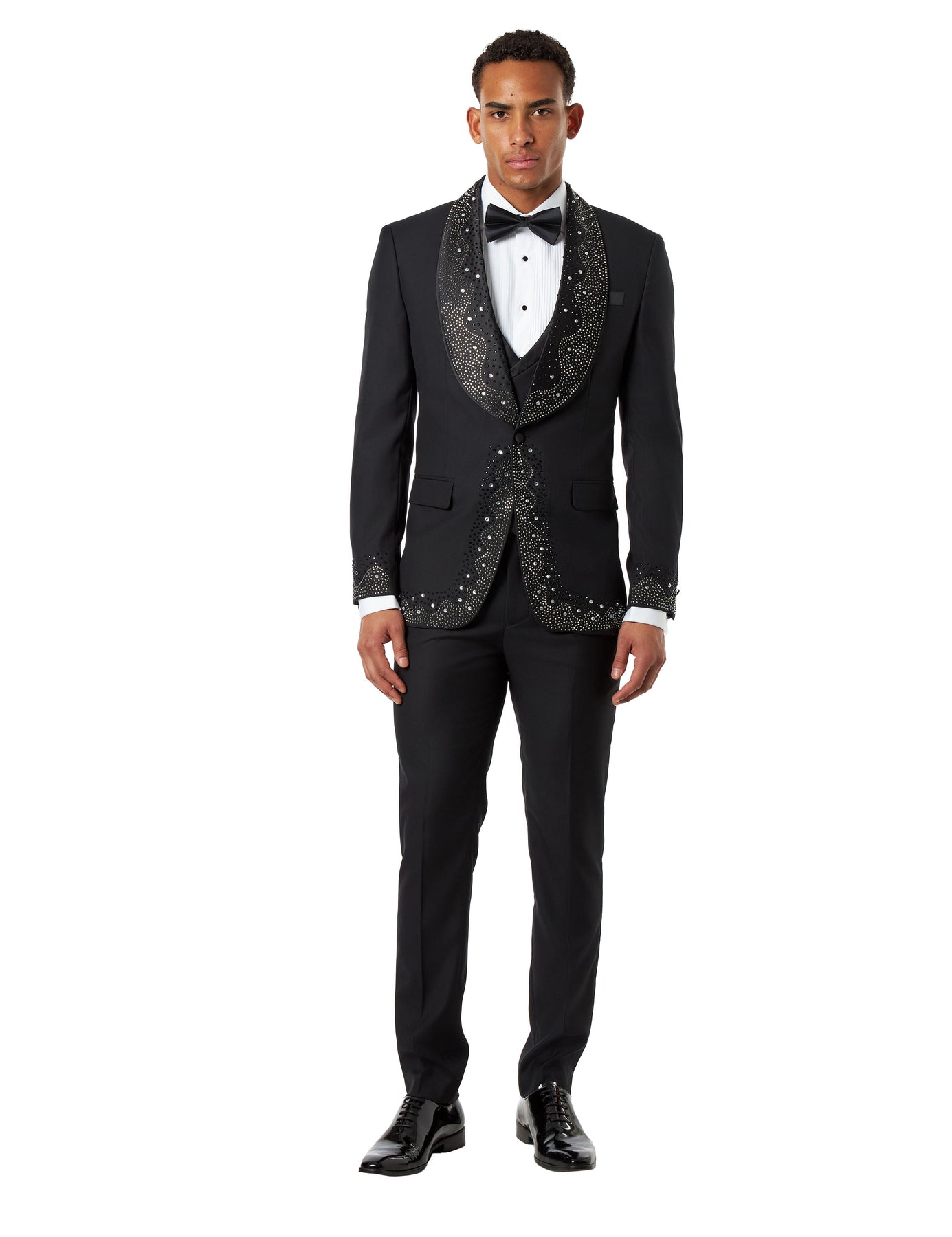 Black Rhinestone Shawl Lapel Tuxedo 3-Piece Wedding Suit