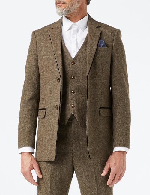 Adorned with sleek black suede piping, a refined two-button front, and a single central vent, this complete 3-piece package includes a jacket, waistcoat, and pants.