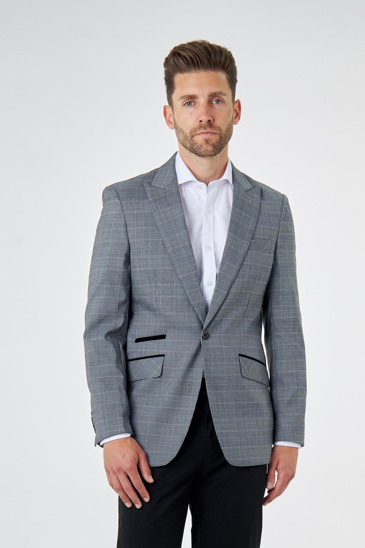 Iconic grey and black Price of Wales check suit jacket is crafted from polyester, rayon and spandex blend fabric for comfort and performance. A modern take on a classic style and design, helping you nail the traditionally inspired look with modern energy. Ideal for weddings and other formal gatherings. Tailored cut with double vent in back strikes the perfect balance between regular and a slim fit for freedom of movement. A versatile jacket every man needs, single breasted design with a classic peak lapel and one front buttons. Finer details two front flap pockets with black suede trimmings.
