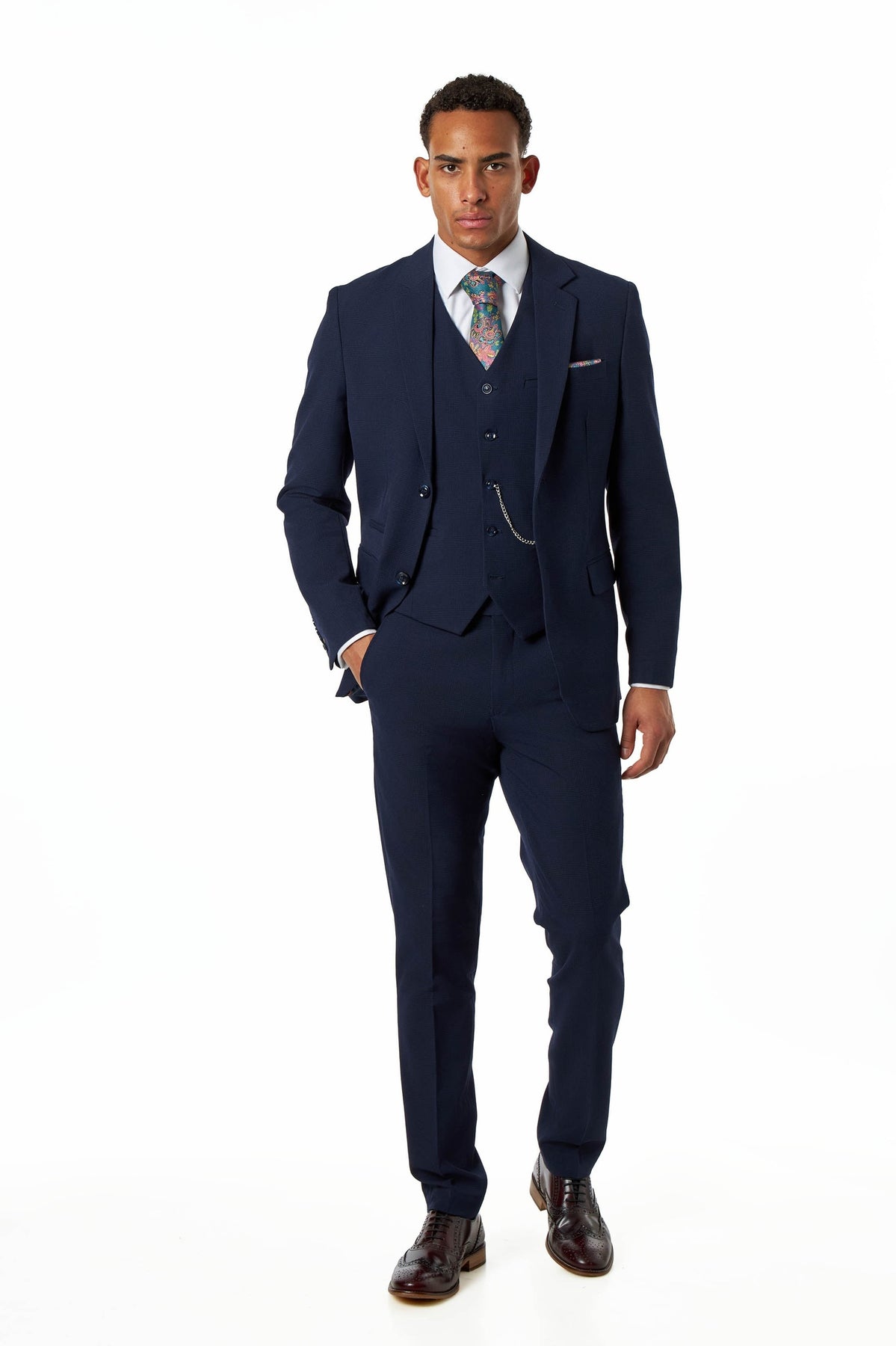 The blazer features a classic notch lapel, clean button fastening, double side vents and practical pocket detailing including welt flap pockets and internal jetted pockets. The matching waistcoat enhances the suit’s structure and sophistication, while the tailored trousers complete the outfit with a modern tapered shape.
