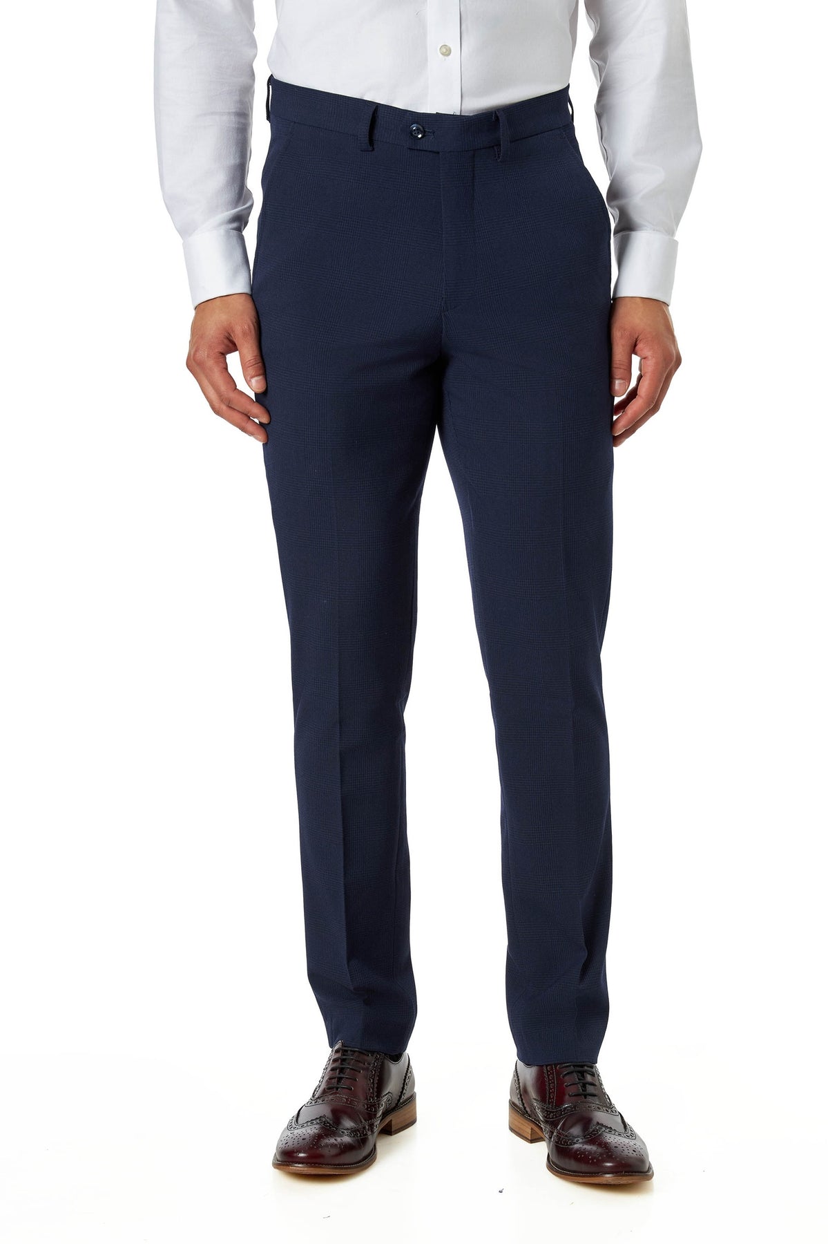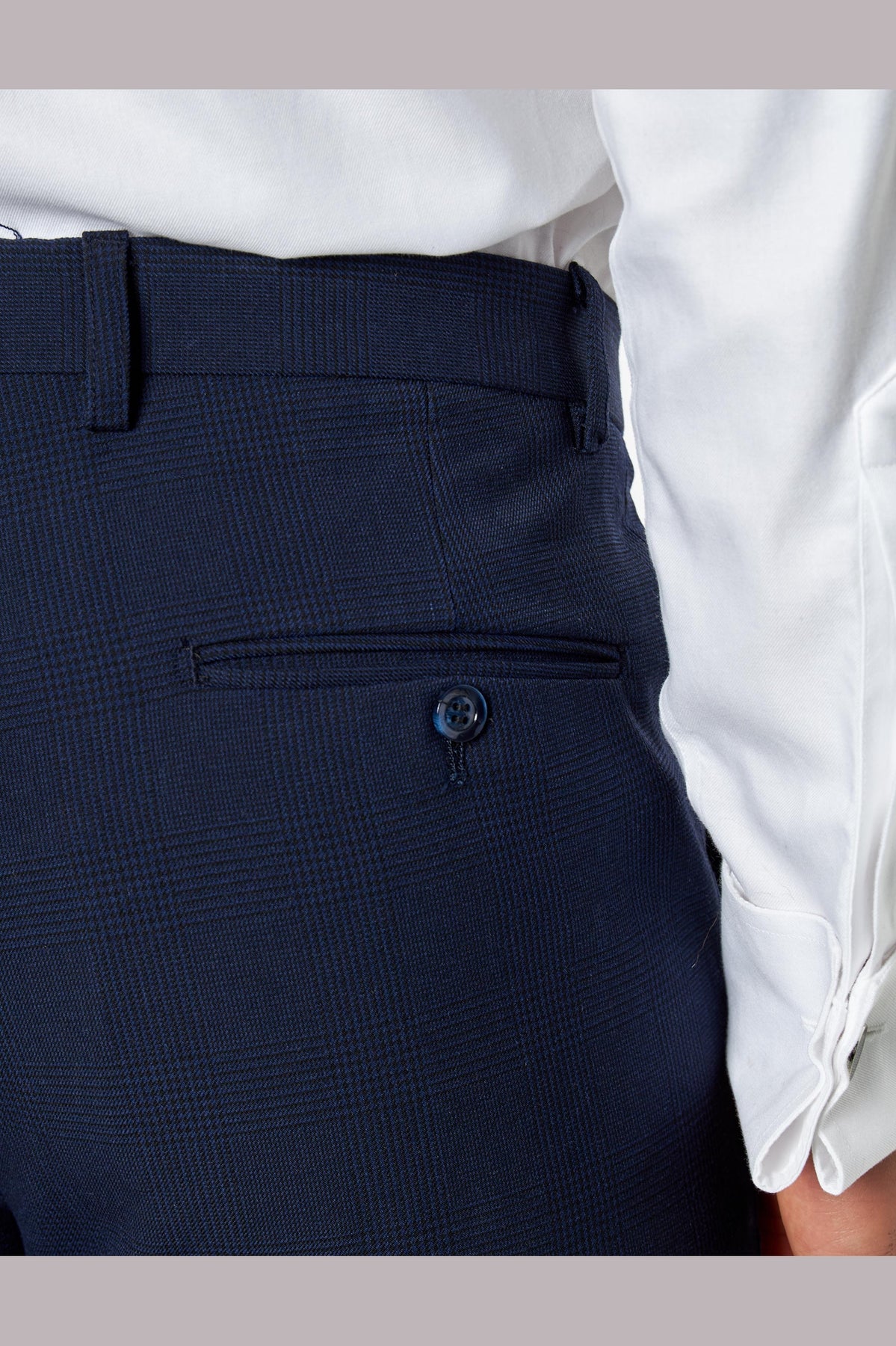Crafted from a premium stretch fabric blend, the subtle navy Prince of Wales check adds texture and depth without overpowering your style. The tailored fit strikes the ideal balance between slim and regular, offering a sleek silhouette while allowing comfortable movement throughout the day.