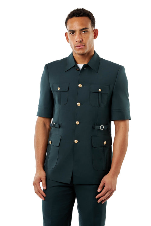 Meet our classic Nuru Safari bush suit, featuring short sleeves and open notch collars, offering a retro look with modern styling.